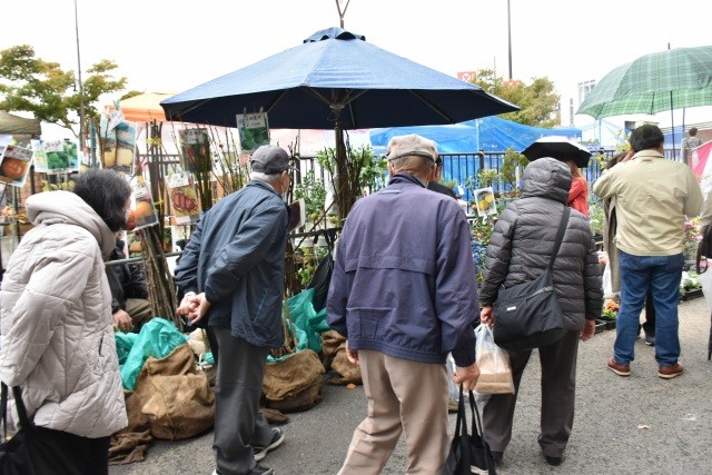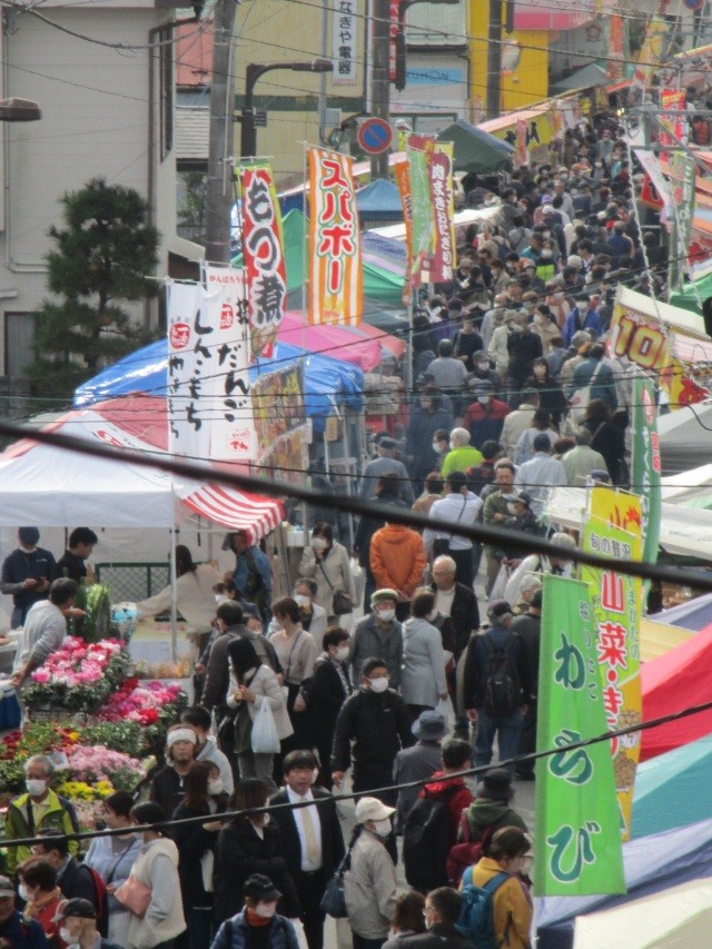 会場である「昭和通り」沿線の露店では,農産物や海産物,植木,瀬戸物,木工製品,食べ物などが陳列され,開催3日間ともにぎわいを見せます。