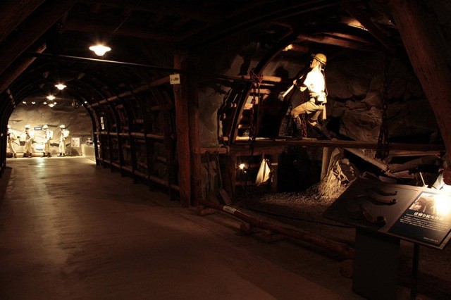 模擬坑道は、石炭坑道に入ったかのような空間。炭鉱ゆかりの資料も展示されています。