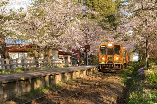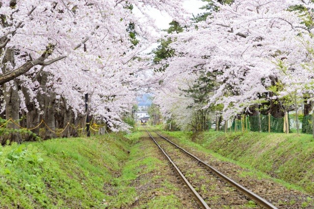 一番の見どころは桜のトンネルをローカル鉄道が走るところ。公園内に津軽鉄道が走り、昔ながらの小さな駅舎やのどかな風景が、訪れる人々を一段と楽しませてくれます。満開の桜の中、津軽鉄道「走れメロス号」が走り抜ける様は、絵になると評判。