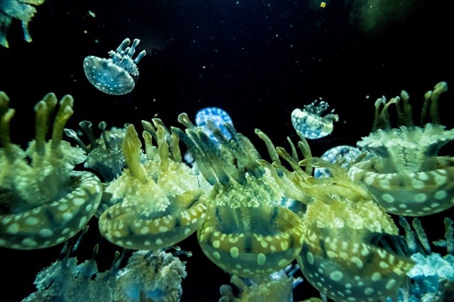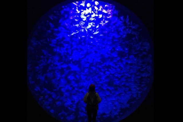 クラゲ展示室「クラネタリウム」には、希少なクラゲがたくさん。中でも直径5mの円形型水槽「クラゲドリームシアター」に10,000ものミズクラゲが浮遊する様は圧巻!時間ごとに行われる解説プログラム 「クラゲのおはなし」も必見です。