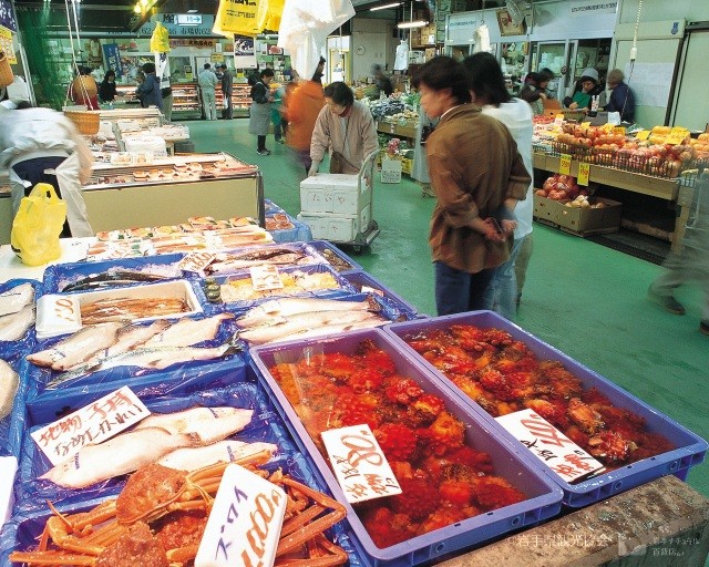 みやこしぎょさいいちば2019年3月、リニューアルオープンした宮古市の台所『宮古市魚菜市場』。朝6時半から始まる市場には、近海で水揚げされたばかりの新鮮な魚介類の他、地元の農家で栽培された新鮮な野菜・フルーツが並べられ、朝早くから活気に満ち溢れています。施設内には多くの専門店が軒を並べ、市場特有の威勢の良い声が響きます。