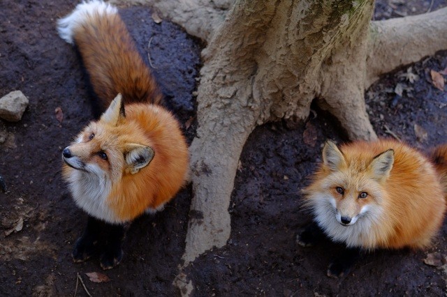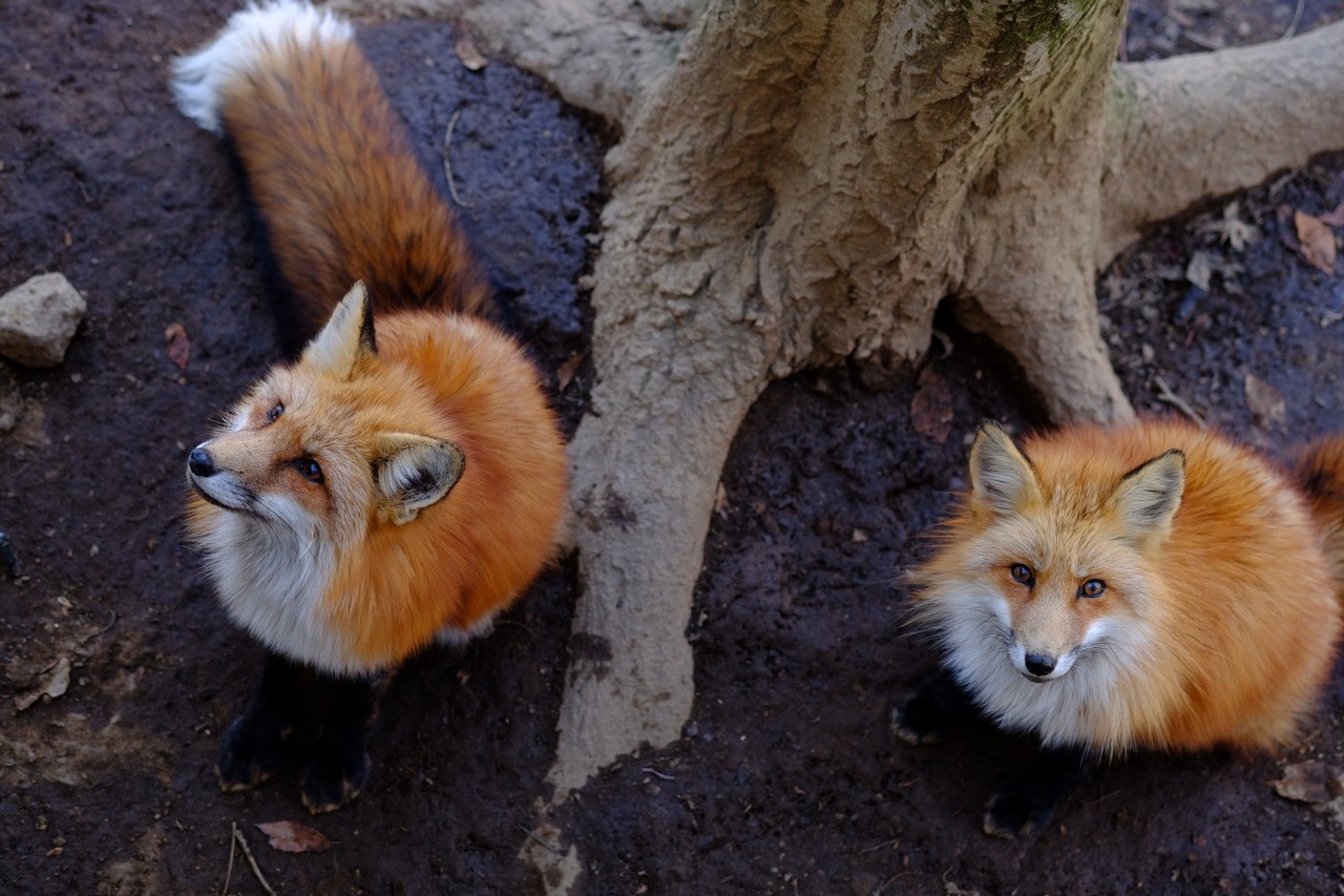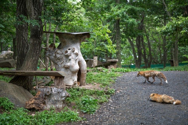 みやぎざおうきつねむら100頭以上の放し飼いになっているキツネたちがお出迎え。おなじみのキタキツネと、めずらしい種類の銀ギツネ、ホッキョクギツネ(青と白)、プラチナギツネ、十字ギツネの合計6種類がいます。