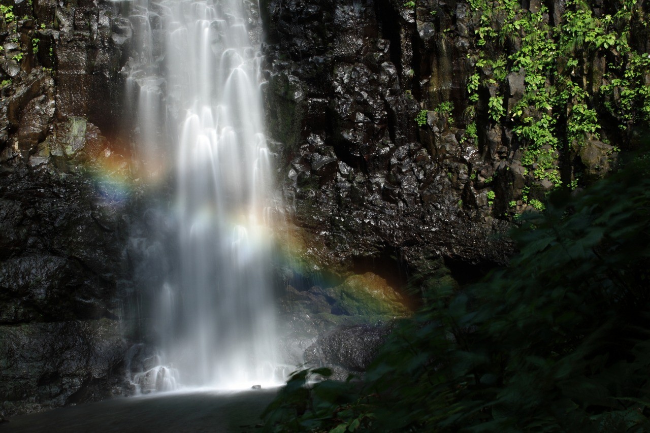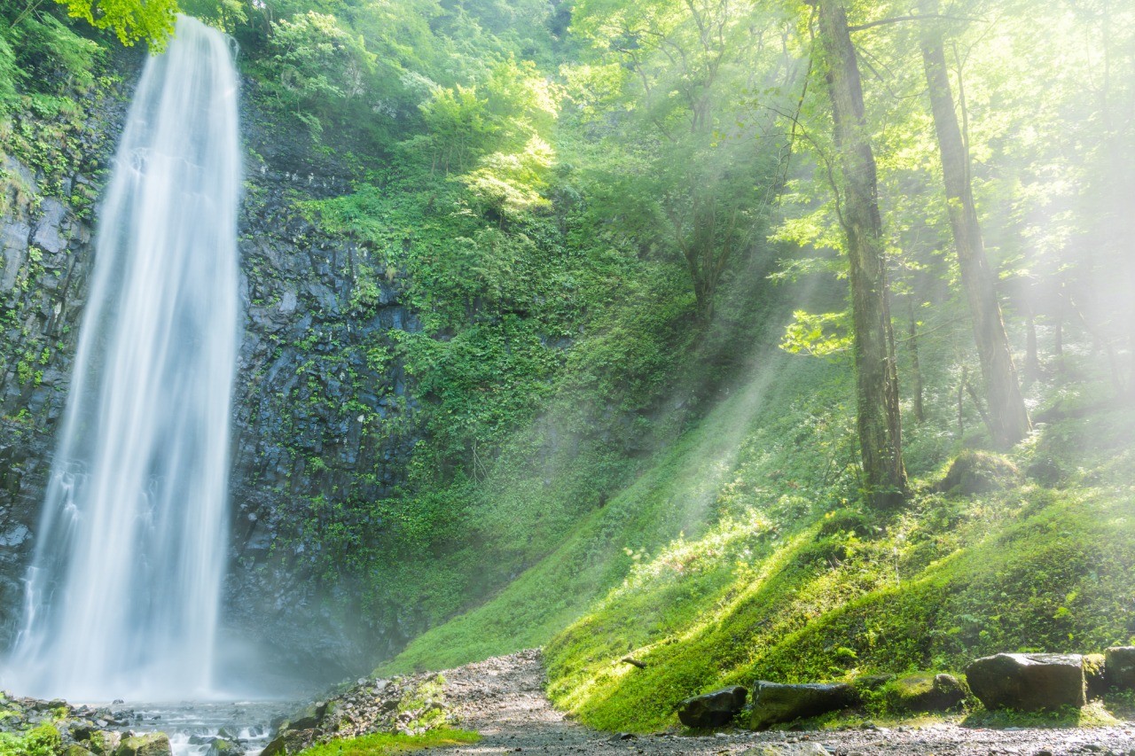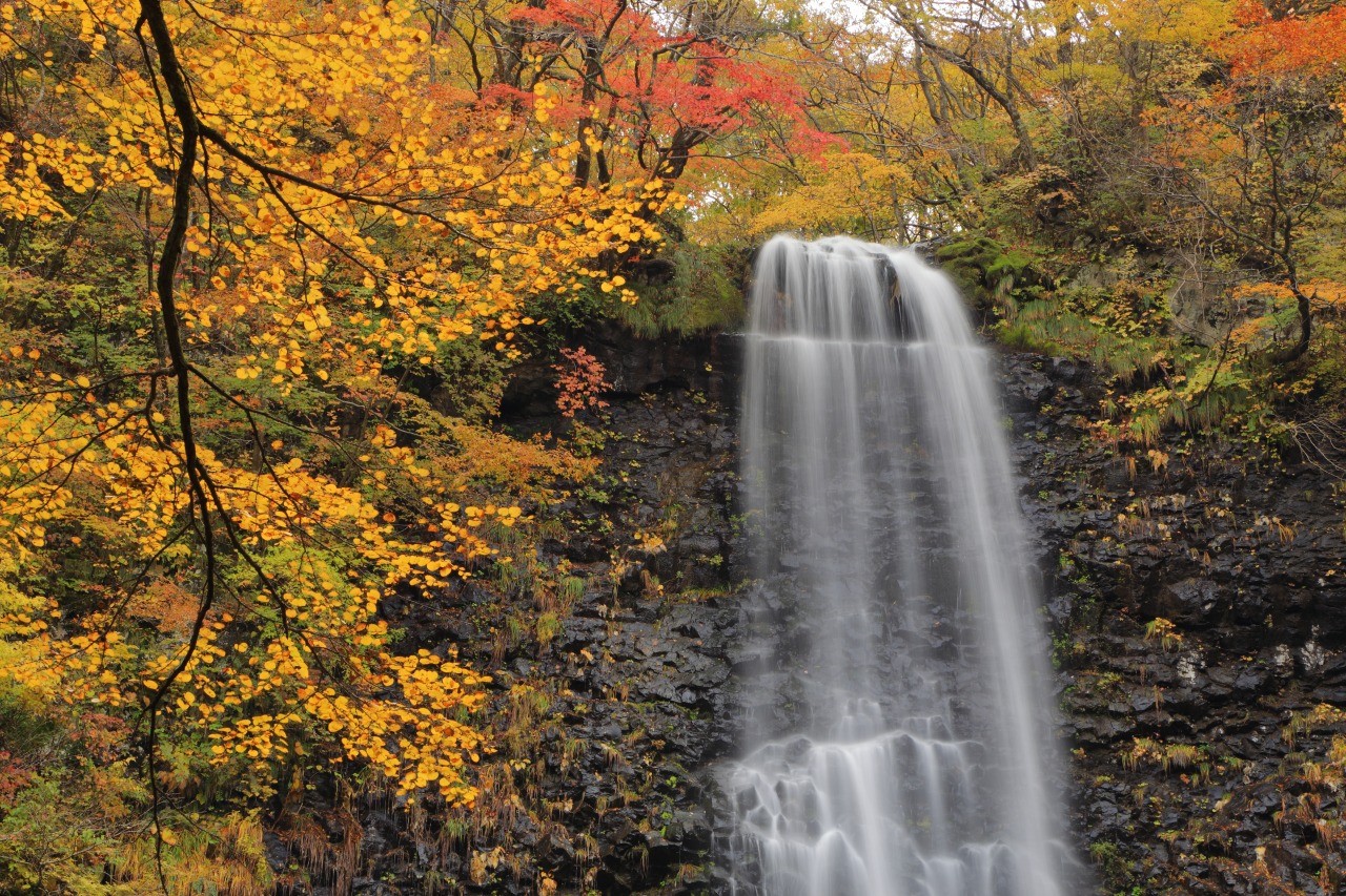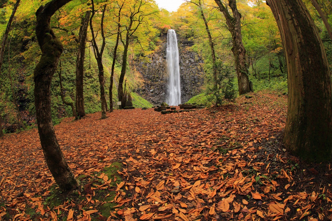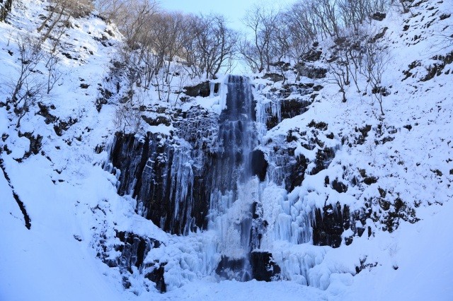 高さ63m、幅5mのサイズもさることながら、断崖絶壁から垂直に落ちる様子は大迫力。豪快で壮麗な滝を眺め、霧状の水しぶきを浴びると身も心も浄化されるよう。例年、桜が咲くGWの頃(4/28〜5/5)と、お盆の頃(8/11〜18)にはライトアップも実施され、闇に浮かぶ神々しい滝の姿を見ることができます。新緑・紅葉時期の美しさもさることながら、氷瀑となった光景も幽玄で見事。1月中旬から2月上旬に見られ、この地の自然の厳しさ・険しさを感じさせてくれます。冬はスノーシューなどの装備が必要です。