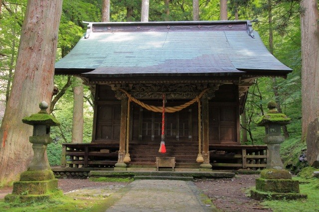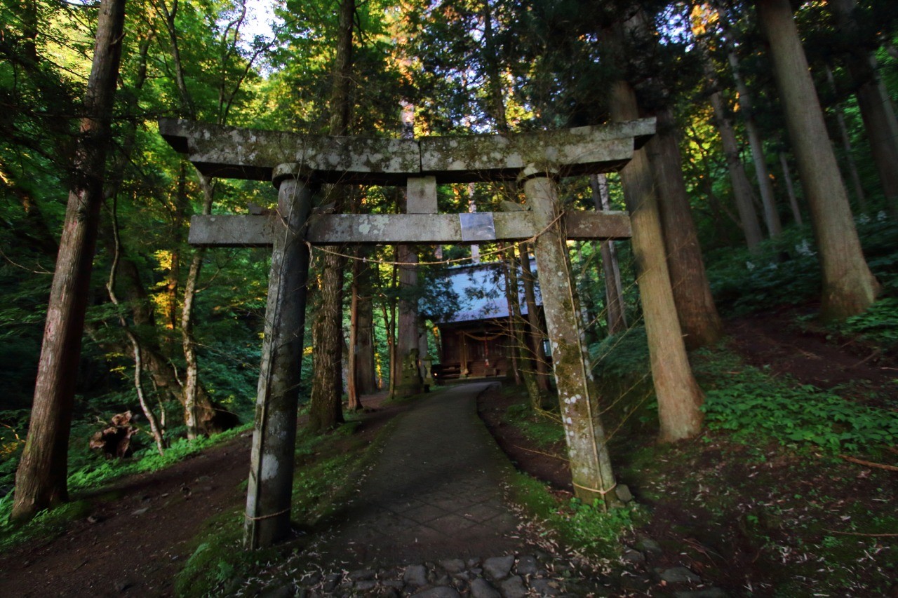 たますだれのたき高僧・弘法大師の夢枕に不動明王の化身が現れ、そのお告げに従って滝を発見・命名したと伝えられる「玉簾の滝」。いわれのある霊地の滝ということで、山岳宗教の信仰の対象となり、山籠もりの厳しい修験が行われました。滝の前には「御嶽神社」が祀られています。