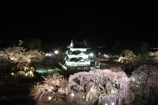 また、秋には約1,000本のカエデや2,600本の桜の紅葉が鮮やかに色づき、菊の装飾やフラワーアートが会場を彩る「弘前城菊と紅葉まつり」、冬には市民手づくりの約150基の雪燈籠や雪像、灯りがともされた約300基のミニカマクラ群など、幻想的な世界が広がる「弘前城雪燈籠まつり」が開催され、四季折々の美しい光景を楽しむことができます。