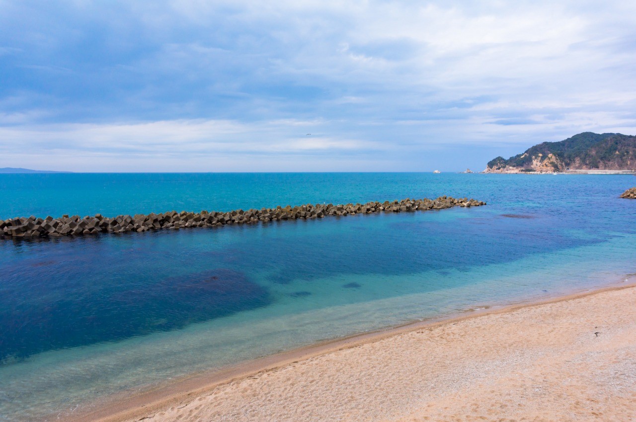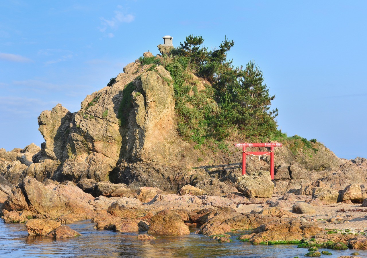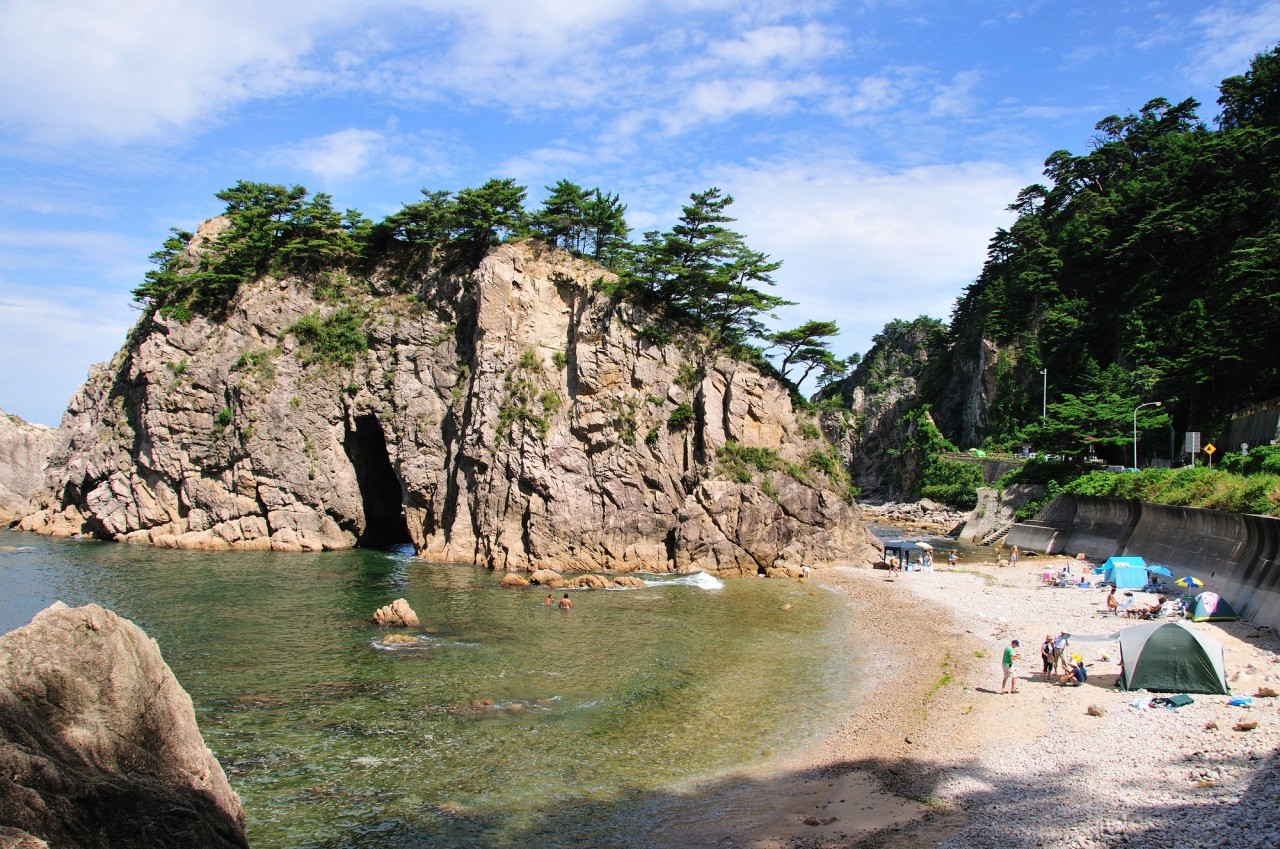 ささがわながれ澄み切った碧い海と白砂のコントラストが美しい場所。笹川流れは村上市にある11km続く海岸です。日本海の荒波の浸食によりできた奇岩、岩礁や洞窟など、変化に富んだ風景が広がり、豪壮な景観は国指定の名勝及び天然記念物となっています。