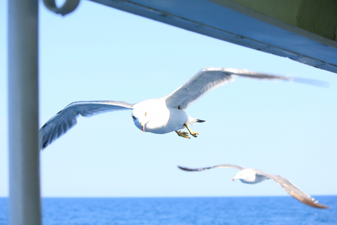 笹川流れの美しい景色を堪能するなら、遊覧船は外せません。眼鏡岩、恐竜岩といった数々の奇岩が出迎える雄大な造形は圧巻です。約40分間の船旅では、途中カモメに餌付けをすることもでき、お子様も楽しめます。間近に迫るカモメはかなりの迫力。