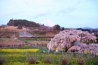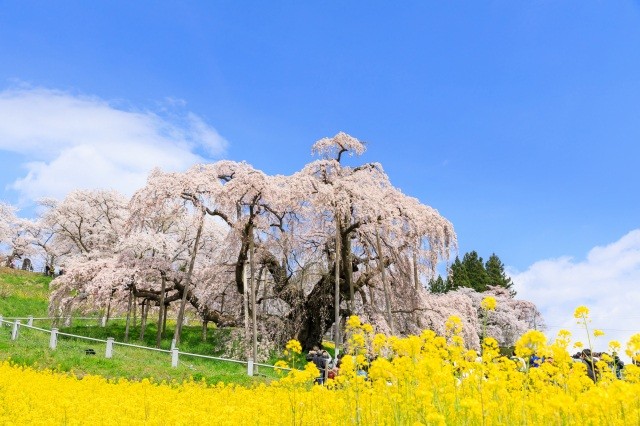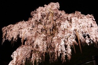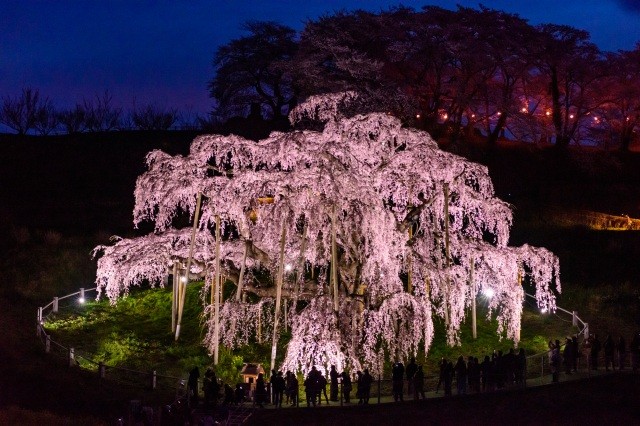 樹高は13.5メートル、根回りは11.3メートル、枝張りは幹から東西に25メートル・南北に20メートルの巨木で、近くから見た姿は圧巻。薄紅色の小さな花を枝いっぱいに咲かせ、流れ落ちる滝のように見えることから「滝桜」と呼ばれるようになったとも言われています。昼はもちろん、夜間にライトアップされた滝桜も必見です。(ライトアップ期間は開花状況により決まります。)