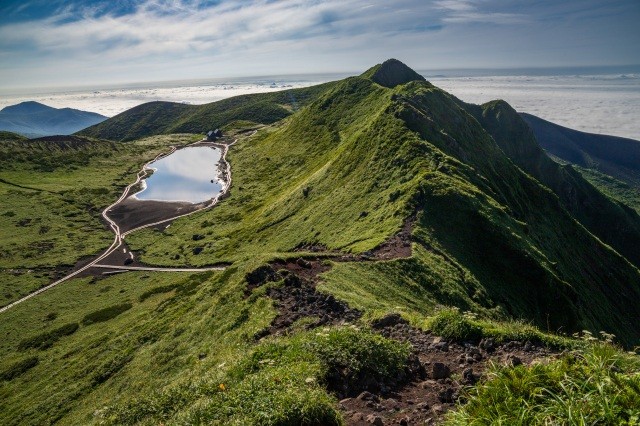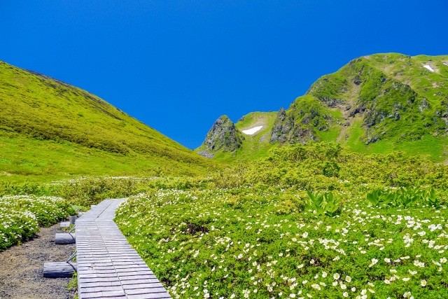 周囲に木道が敷かれている阿弥陀池が、トレッキングコースの中心。バスで八合目まで行けば、阿弥陀池までは1時間10分ほど。標高差も少なく、初心者でも歩きやすいコースです。阿弥陀池からさらに足をのばした馬場の小路コースは別名「ムーミン谷」とも呼ばれ、お花畑や雪渓を眺めながら木道を歩けます。