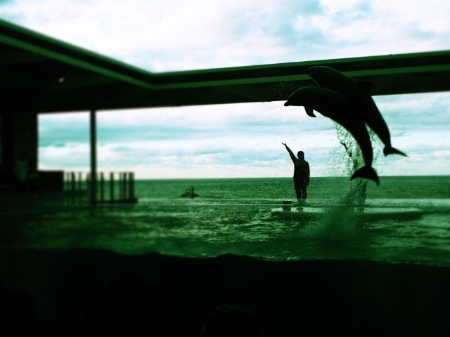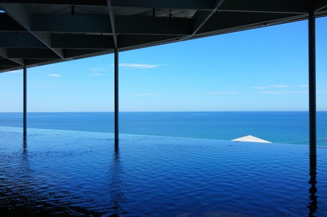 可愛いシロイルカも大人気。最上階には、日本海とつながっているかのようなインフィニティプールがあり、バンドウイルカたちの豪快なジャンプを見ることができます。