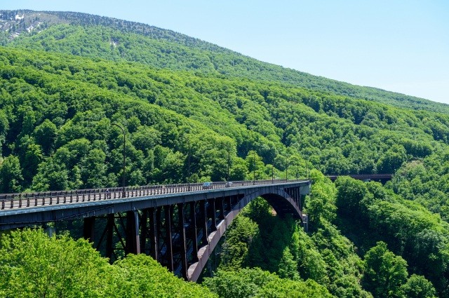 じょうがくらおおはし「十和田八幡平国立公園」内にある城ヶ倉大橋。全長360メートル、アーチ支間長255メートルの日本一の上路式アーチ橋となっており、その橋の上からの眺めは圧巻の一言。