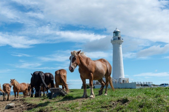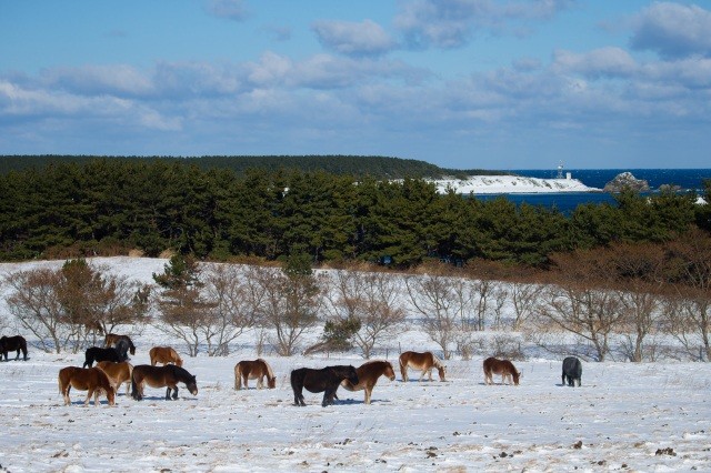 尻屋崎周辺にある牧草地には寒立馬(かんだちめ)という馬が放牧されています。寒立馬は、寒気と粗食に耐え持久力に富む農用馬として重用されてきましたが、時代の移り変わりと共に激減。しかし、その後の保護政策により現在は30頭ほどに回復しています。4月~6月頃が寒立馬の出産シーズンなので、運が良ければ生まれたばかりの仔馬に出会えるかも?尻屋崎周辺が閉鎖される1月~3月は、アタカと呼ばれる放牧地で毎日を過ごします。