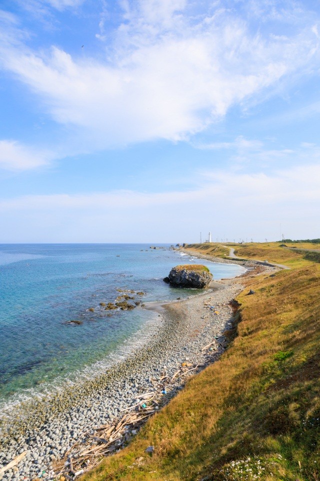 しりやざき本州最北東端の岬。最果ての地といった風情が漂います。風が強く、かつて昔は多くの船舶が座礁・遭難して「海の墓場」と呼ばれていたそう。岬の先端には、120年以上の歴史があり、日本最大級の明るさを誇る白亜の灯台があり、参観料を払うと登れます。128段の階段を上った先の景色は、津軽海峡と太平洋。2つの海で深い青と明るめの青が交じり合います。
