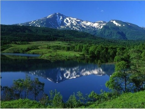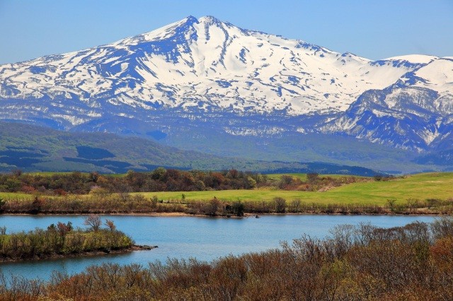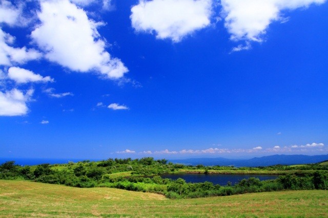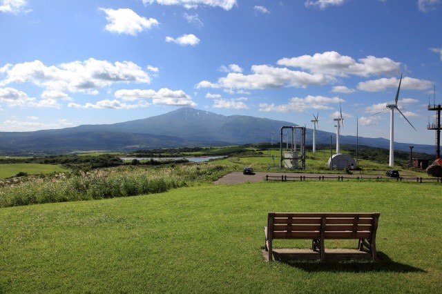 にかほこうげん広々とした牧草地、たくさんの風車、点在する大小の湖沼と湿原、四季折々の草花、のんびりと草を食むジャージー牛の姿…鳥海山の北麓の丘陵地帯に牧歌的風景が広がります。