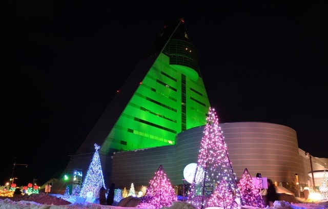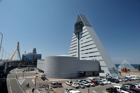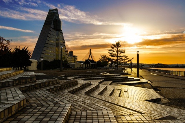 あおもりけんかんこうぶっさんかん あすぱむ「AOMORI」の「A」を形どった正三角形の建物が特徴的。海沿いにあり、夜はライトアップが綺麗です。