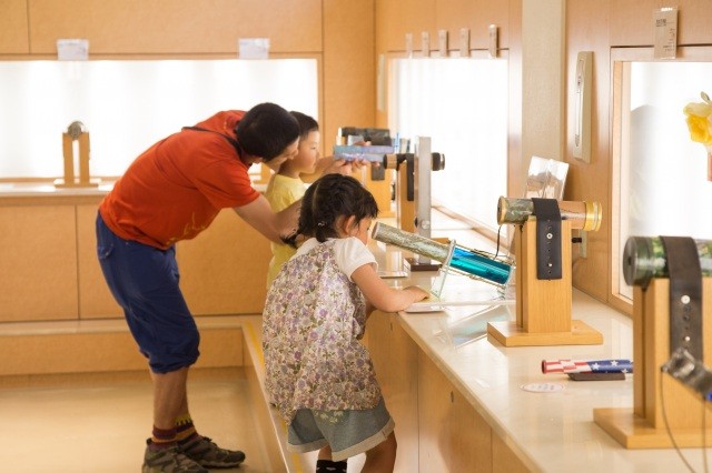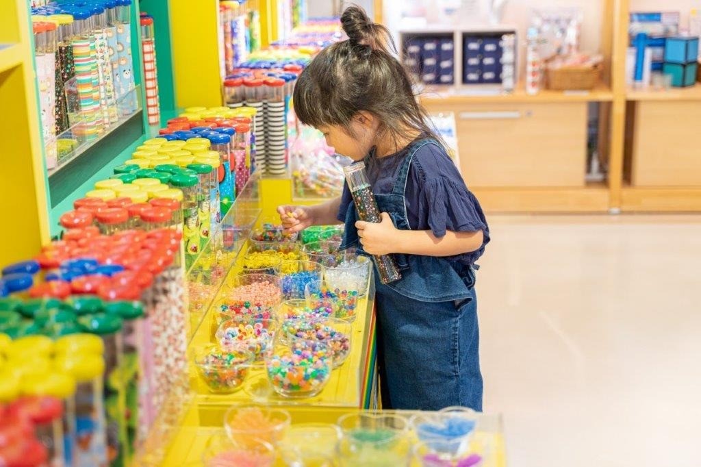 1階はミュージアムショップと体験コーナー。ショップにはリーズナブルな万華鏡から作家作品まで多数あり、選ぶのも楽しい!手作り体験コーナーでは、予約不要で素敵なオリジナル万華鏡を制作できます。「かんたん体験」は、好きな筒にビーズを選んで入れるだけ!5分から10分で素敵な万華鏡が作れます。本格的なプランでも所要時間30分で作れるので、ぜひお試しを。