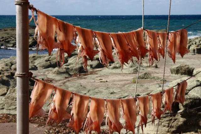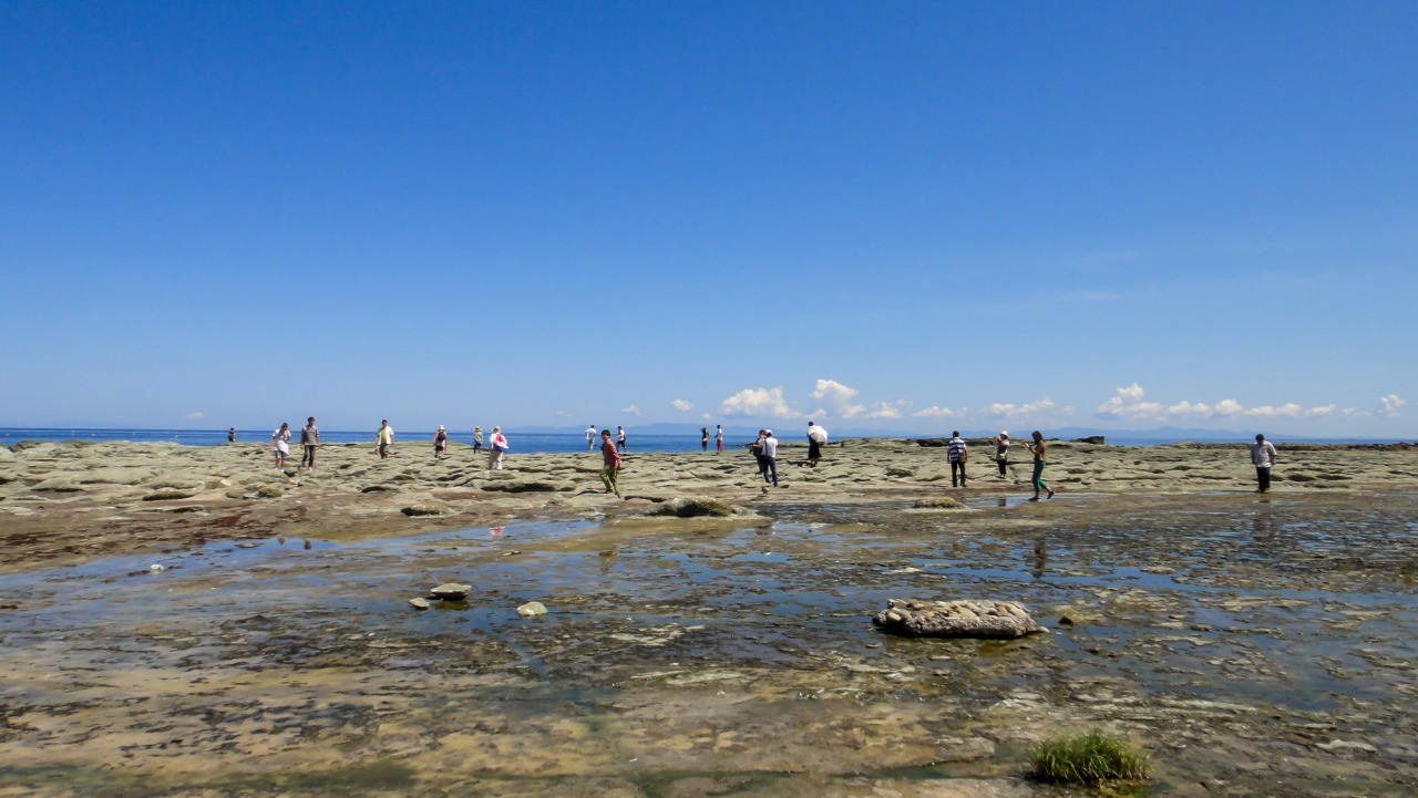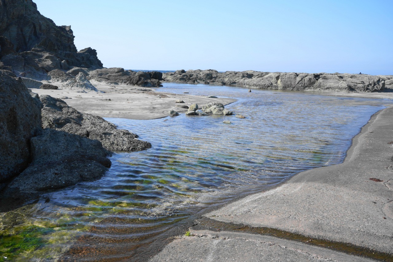 夏場は海辺散策や海水浴で人気のスポット。近くに焼きイカを売っているお店もあり、たくさんのイカがカーテンのように干された風景もユニーク。