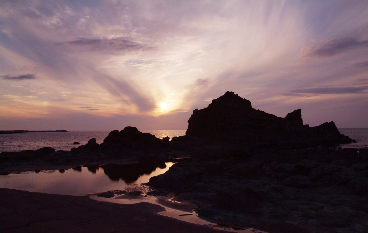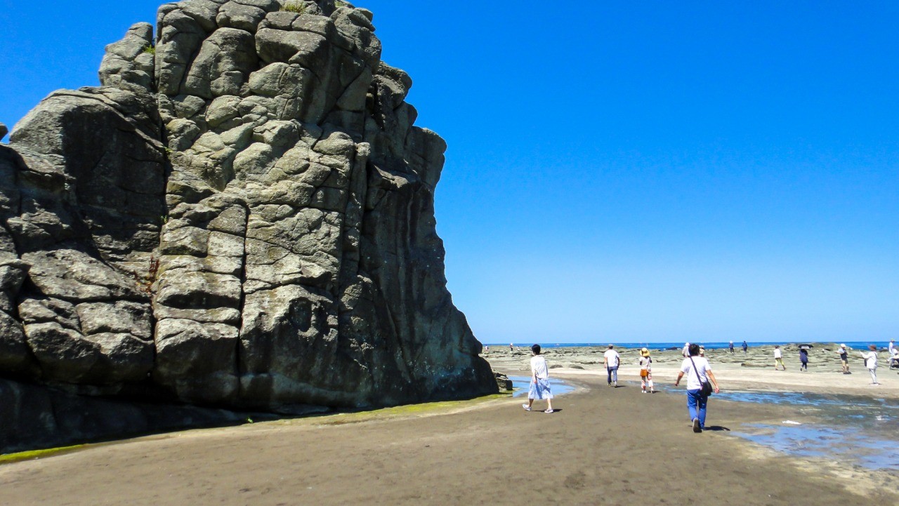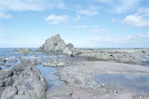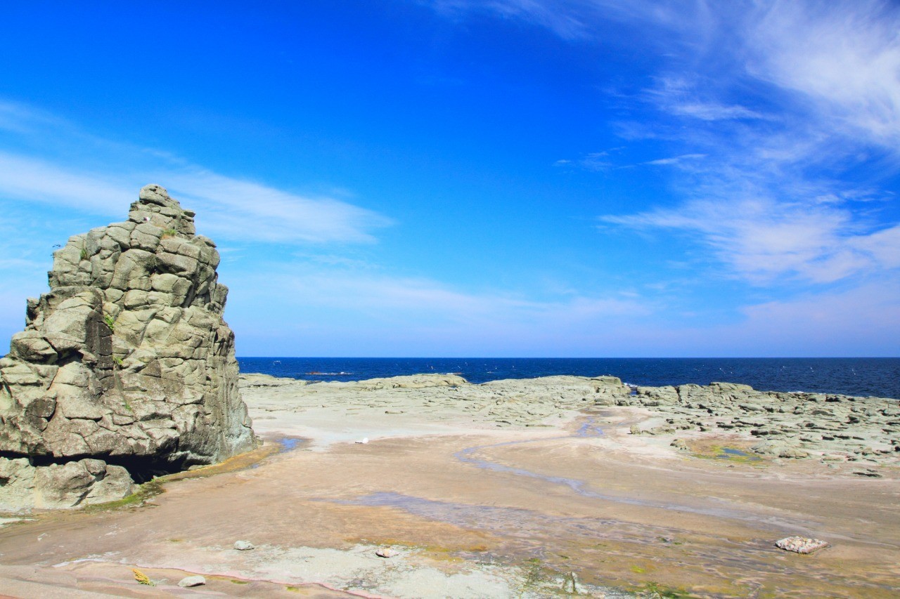 せんじょうじきかいがんその昔、殿様が千畳の畳を敷き酒宴を催したといわれる岩棚が広大に続く「千畳敷海岸」。恵比寿岩、かぶと岩などと名づけられた奇岩が海岸線に続く様は圧巻。他の星に降り立ったかのような不思議な気持ちにさせられる光景です。夕暮れ時には夕陽をバックにした独特な形の岩がシルエットに。夕日の名所としても名高く、「日本の夕陽百選」にも選ばれています。