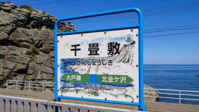 千畳敷海岸は五能線の快速「リゾートしらかみ」の千畳敷駅から道路を渡ってすぐ。ここは駅舎も壁もない無人駅。観光客が散策できるよう15分ほど停車してくれる電車もあるので、時刻表は要チェック!発車数分前の合図として鳴らしてくれる汽笛も旅愁を誘います。