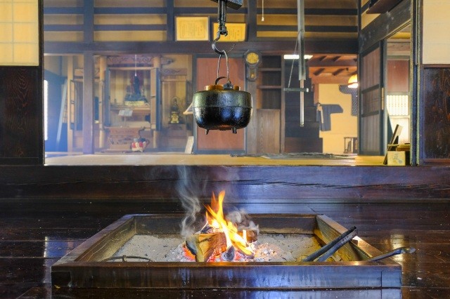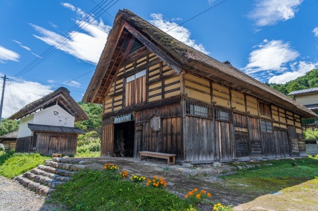 1907年(明治40年)、集落が全戸消失するという大火に遭い、同一の大工集団によって一斉に再建されたため、統一的な景観が生まれました。曲家とは、その文字の通り、L字に曲がった住まいのことです。手前の突出部には、生活(農耕や運搬)に欠かせない牛や馬を、そして奥の建物は人の生活空間として、かつて家族同様に大切にされてきた農耕馬と人とが同じ家の中に暮らしていました。