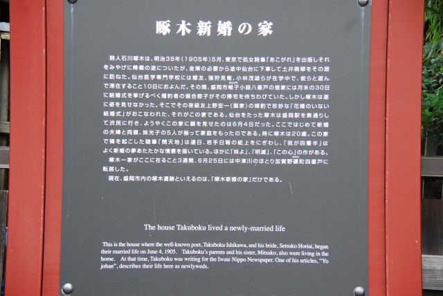 たくぼくしんこんのいえ盛岡市出身の詩人、石川啄木が1905年(明治38年)から妻・堀合節子と新婚当初3週間暮らした家で、現存する盛岡唯一の武家屋敷。藩政末期に建築されたと推定されており、盛岡市指定有形文化財に指定されています。屋根は防火のため鉄板で覆われていますが、もともとは茅葺き屋根でした。