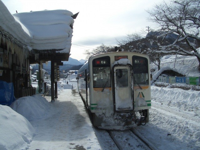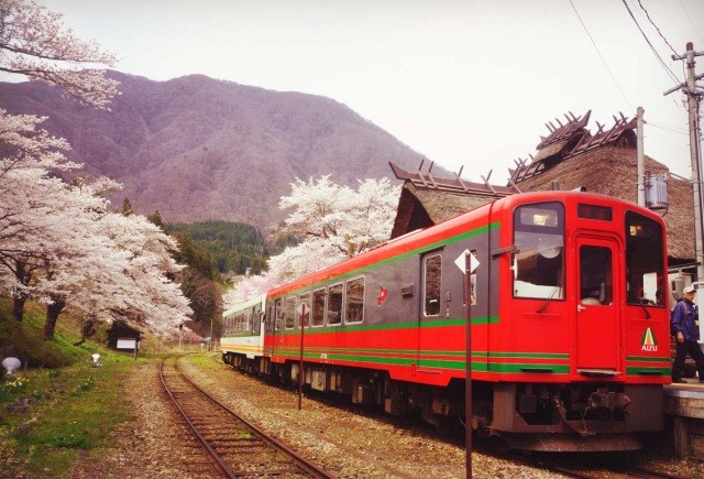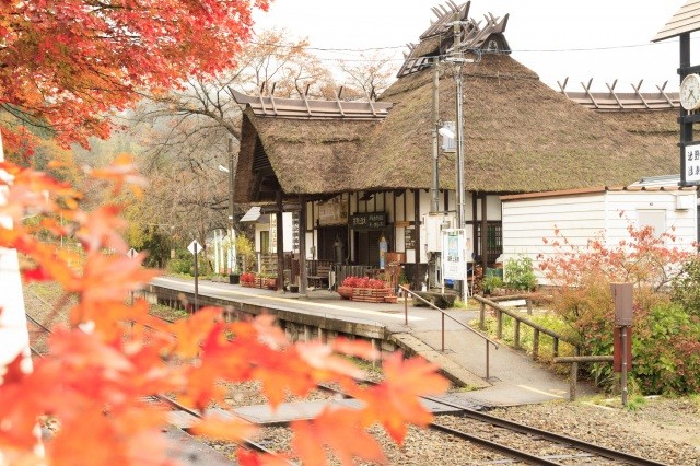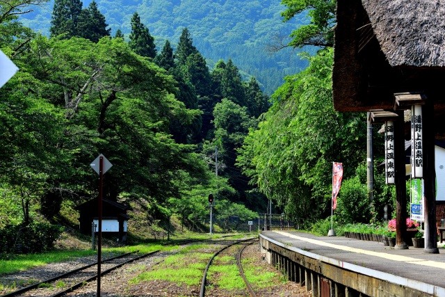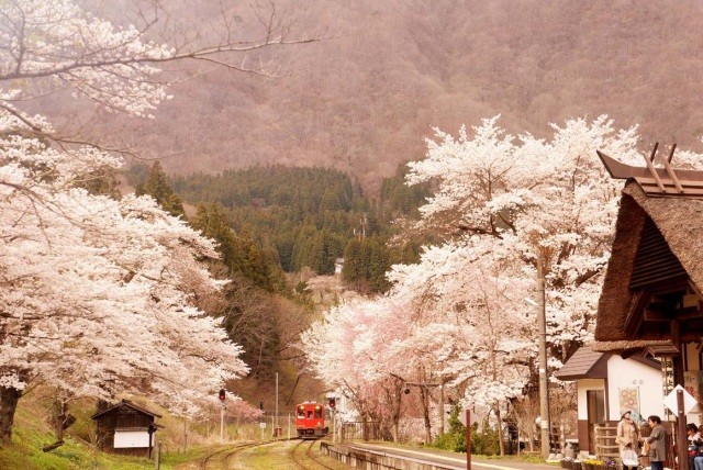 線路沿いには桜の木が並び、桜の名所としても有名。桜が開花する春には多くの人が、茅葺き屋根の駅舎と美しく咲き誇る桜と列車とのコラボレーションを見に訪れます。春だけでなく、山々の濃い緑が美しい夏、山々が一面に紅葉する秋、雪が多く積もる冬など、四季を通して風情ある美しい駅です。