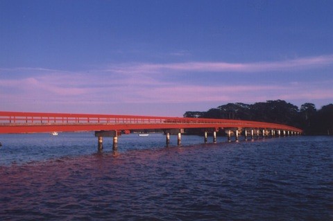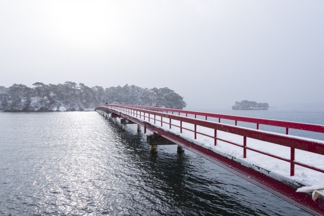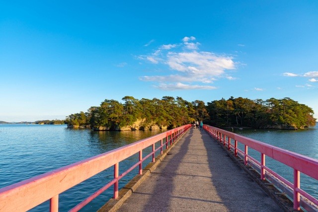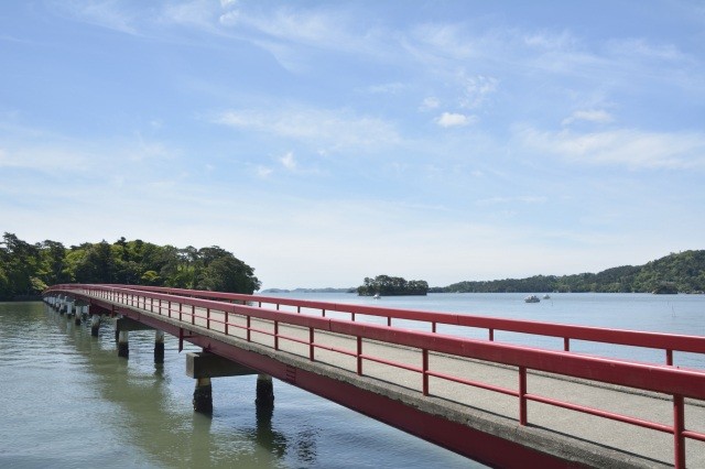 ふくうらじま福浦島は、全長252メートルの鮮やかな朱塗りの福浦橋(別名:出会い橋)で陸と結ばれています。橋を通行するには大人200円・子ども100円かかりますが、渡る価値あり!なんとも心地よい風に吹かれながら橋を渡りきると福浦島。島には赤松、杉、モミなど約250種におよぶ草木が茂り、遊歩道も設けられた自然公園になっており、散策も十分に楽しめます。茶店などの施設もあります。