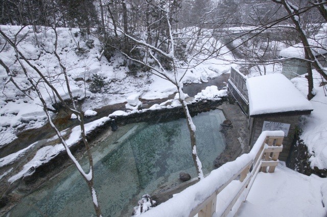 かっぱの湯は、無料。簡単な脱衣所があるのみのですが、神秘的なエメラルドグリーンの野趣あふれる湯です。冬季閉鎖期間があり、湯舟が1つのため男女別の入浴時間が決まっていますので、ご注意ください。
