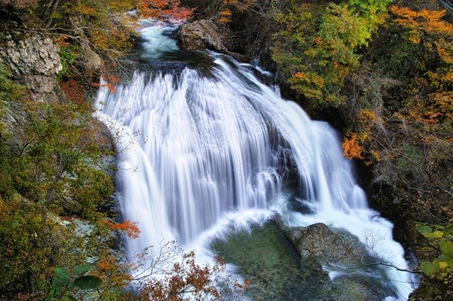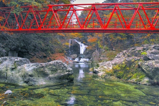 上から見下ろす滝も圧巻ですが、下から見る滝もまた力強さを感じさせます。落差のある細い階段を下り、赤い橋を渡って滝壺へ。ベストシーズンの夏には、透き通った川が新緑を映し、エメラルドグリーンの水をたたえます。天然のプールのような滝壺で川遊びをする人たちも。時にはイワナの姿が見られることもあるほど、澄んだきれいな水です。