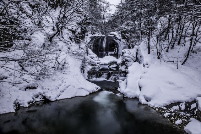 冬、雪景色の滝が気軽に見られるのも嬉しいところ。駐車場からわずか徒歩1分で雪化粧をした関山大滝を望めます。