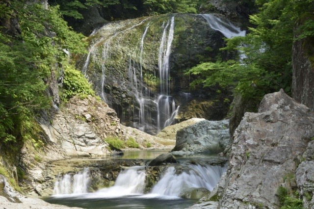 せきやまおおたき奇岩怪石に富む渓谷を豪快に流れ落ちる滝。高さ10m、幅15mと幅広な滝で、エメラルドグリーンの滝壺も美しく、心地よいマイナスイオンを気軽に感じられる穴場スポットです。