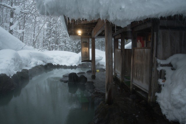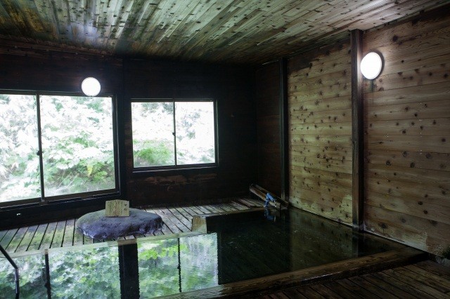混浴露天風呂「唐子の湯」は宿舎から50mほど離れた原生林の中にあり、まさに大自然の中。季節の移ろいを感じながら入浴することができます。新緑の頃は透明の湯に木々の緑が映りこみ、目も癒してくれます。冬は雪見の露天風呂を堪能。夜は提灯の明かりが幻想的で、昼とは違った味わい深さがあります。透明の湯での混浴になりますが、夜は女性専用の時間帯があるため、宿泊して満喫するのがおすすめです。肌に優しいぬる湯の重曹炭酸水素泉で、ゆっくりと浸かれます。