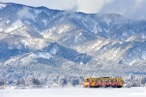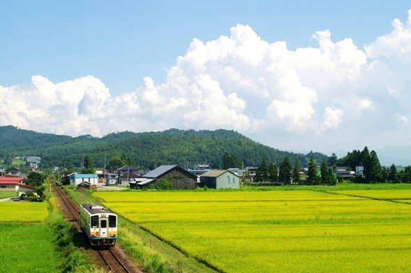 This local line runs about 30.5 km total in southern Yamagata Prefecture. You will see the vast rice fields and distant mountains and in every direction from the windows of the train. Furthermore, "Flower Nagai Line" is named after the famous spots scattered along the railway with a variety of beautiful flowers, such as irises, dahlias, lilies, roses, safflowers, classical cherry blossom trees more than 1,000-year-old, and more. In particular, the places between Nagai Station and Arato Station have few private houses along the track making a picturesque rural scenery woven by the rice fields and the mountains. This is quite popular because you can thoroughly enjoy an original Japanese landscape, including vast snow sceneries in winter and beautiful cherry blossoms in spring.
