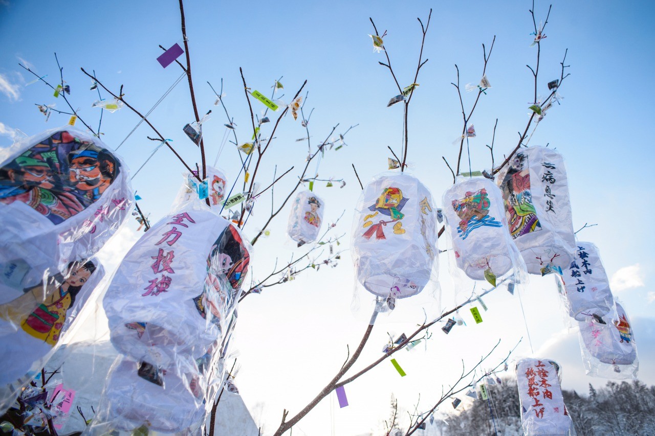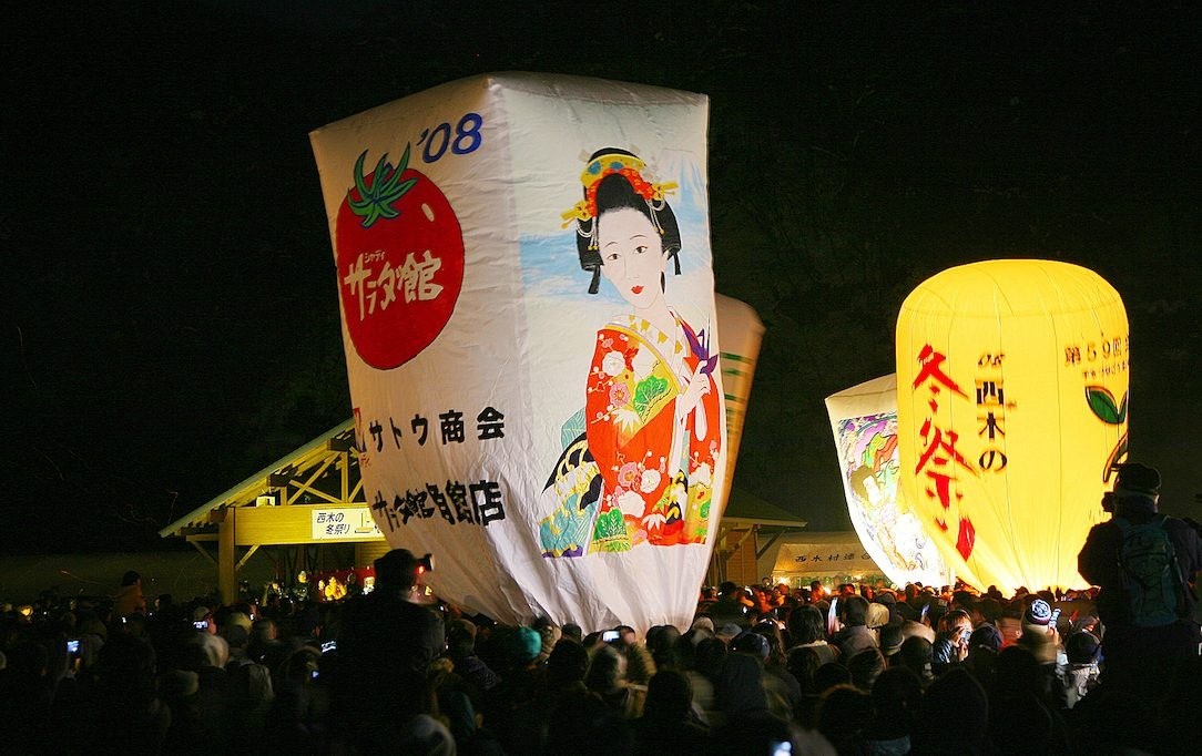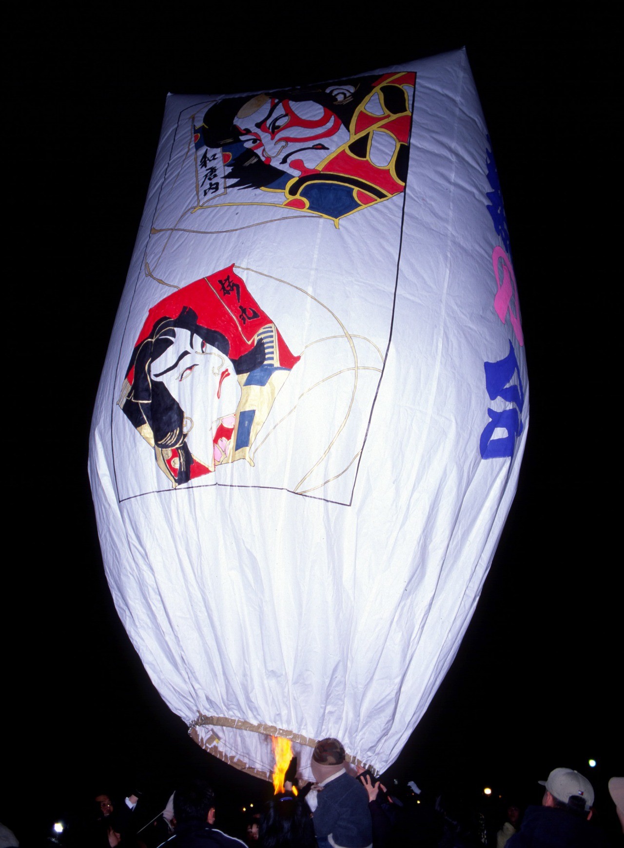 Each year on February 10, massive paper balloons with drawings of warriors, beautiful women, and other pictures are released into the midwinter night sky to convey new thoughts and prayers for the year to heaven. It is a wondrous sight to see almost 100 lit paper balloons soaring in the midwinter night sky. The large balloons are up to 12 meters tall, and the pictures are all hand-drawn. In recent years, some of the balloons have anime illustrations drawn on them.