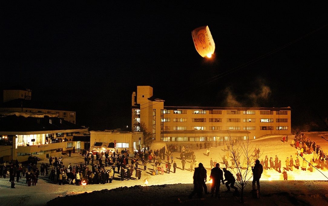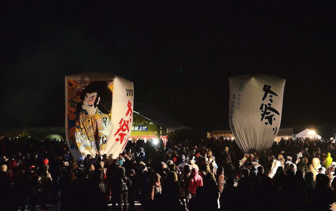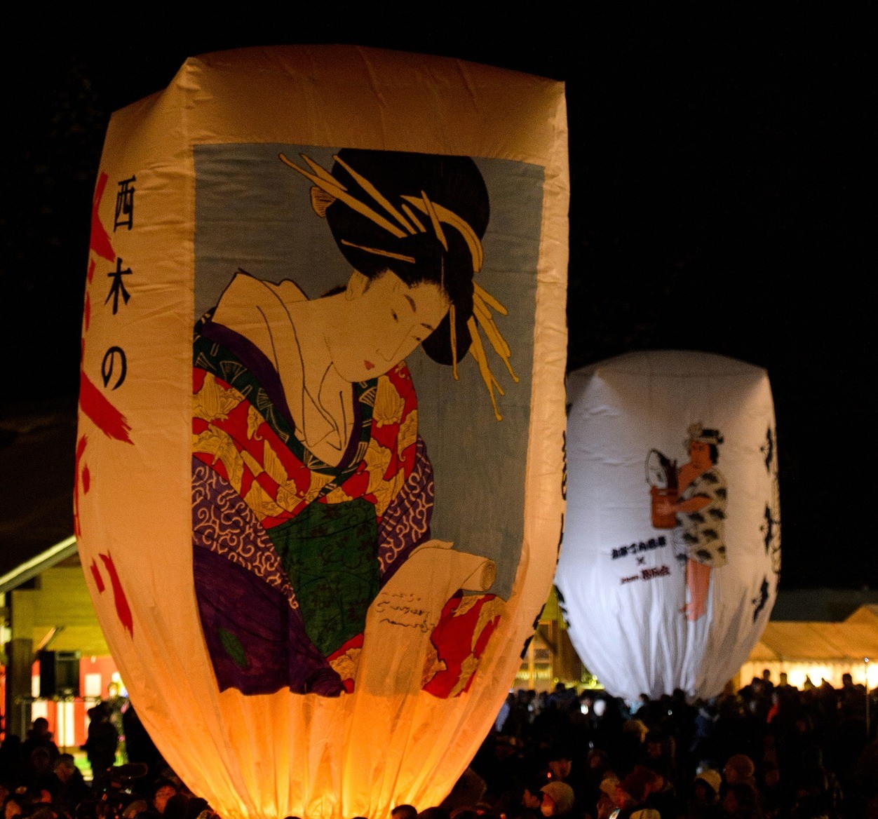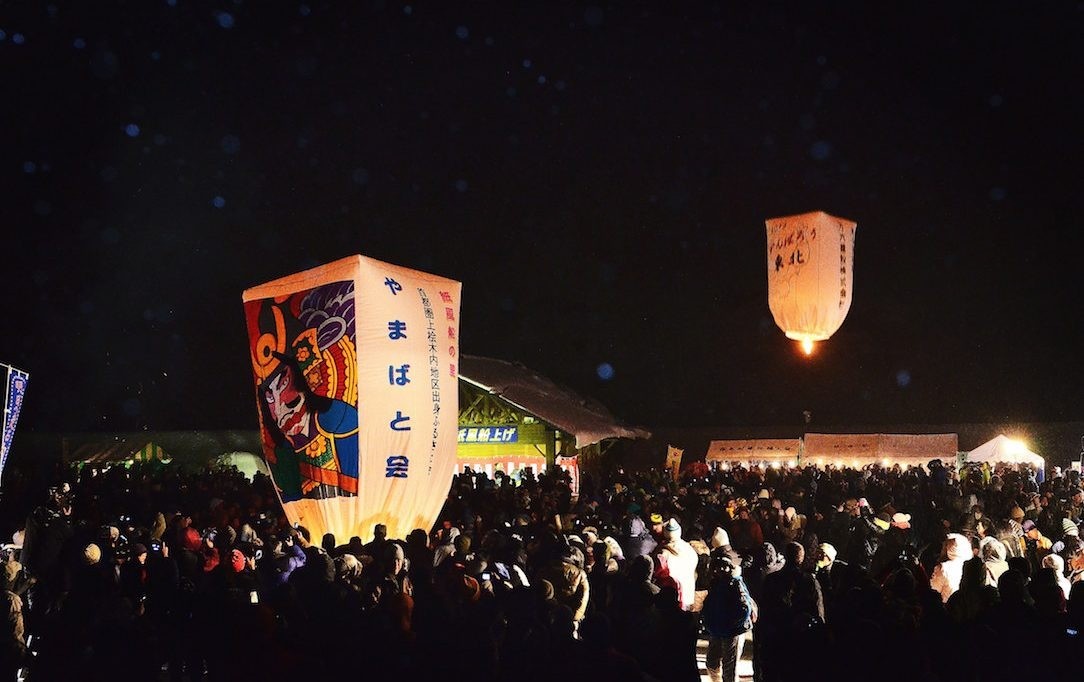 Each year on February 10, massive paper balloons with drawings of warriors, beautiful women, and other pictures are released into the midwinter night sky to convey new thoughts and prayers for the year to heaven. It is a wondrous sight to see almost 100 lit paper balloons soaring in the midwinter night sky. The large balloons are up to 12 meters tall, and the pictures are all hand-drawn. In recent years, some of the balloons have anime illustrations drawn on them.