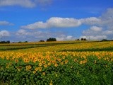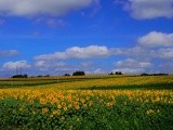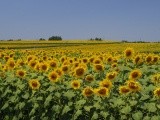 Please come and see the beautiful scenery of bright yellow sunflowers spreading across the hills.