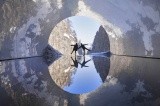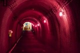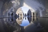 The highlight is the panoramic station at the far end of the tunnel. The walls are made of stainless steel plates and the floor is covered with water, reflecting the grand canyon.