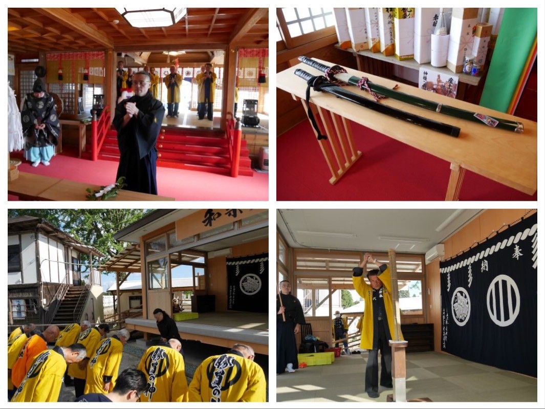 In addition to praying at the shrine, after swordsman Yoshihiro Abe draws his sword in dedication, each participant takes part in the bad luck banishing swordsmanship training.