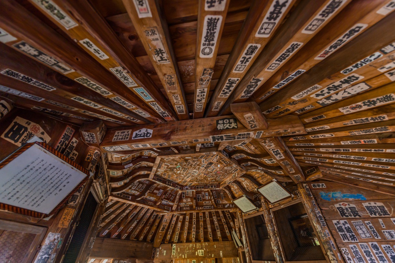 Sazae-do was once part of a pilgrimage trail with 33 Kannon statues lining the slope up to the structure. Pilgrims came here as an alternative to the Saigoku Kannon Pilgrimage and today the ceiling of Sazae-do is still covered with stickers from people who accomplished the pilgrimage here.