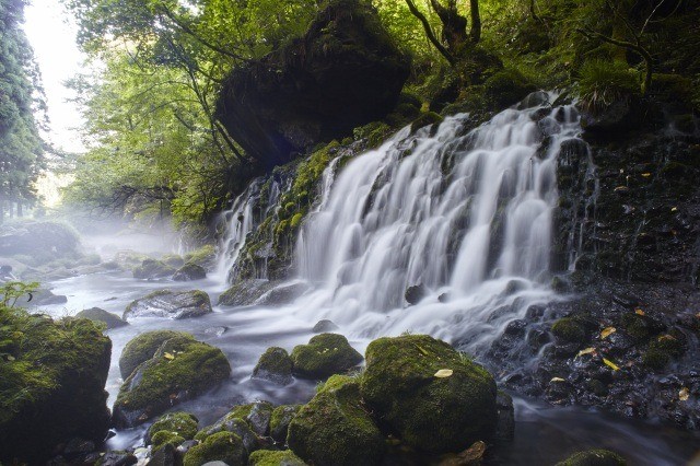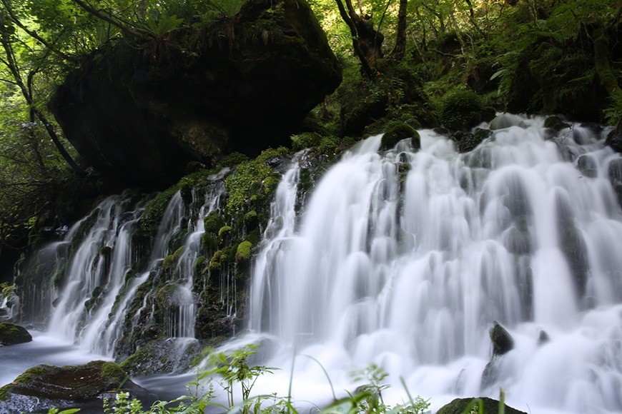 The Mototaki Fukuryusui Underflow features the beautiful contrast between the green moss and white water spray. About five tons of water bursts abundantly from the 30 meter-long rock area each day, keeping the moss vibrant throughout the year with plenty of water. This sightseeing spot makes you feel its refreshing, mysterious beauty when it is enveloped in white fog from the water spray.