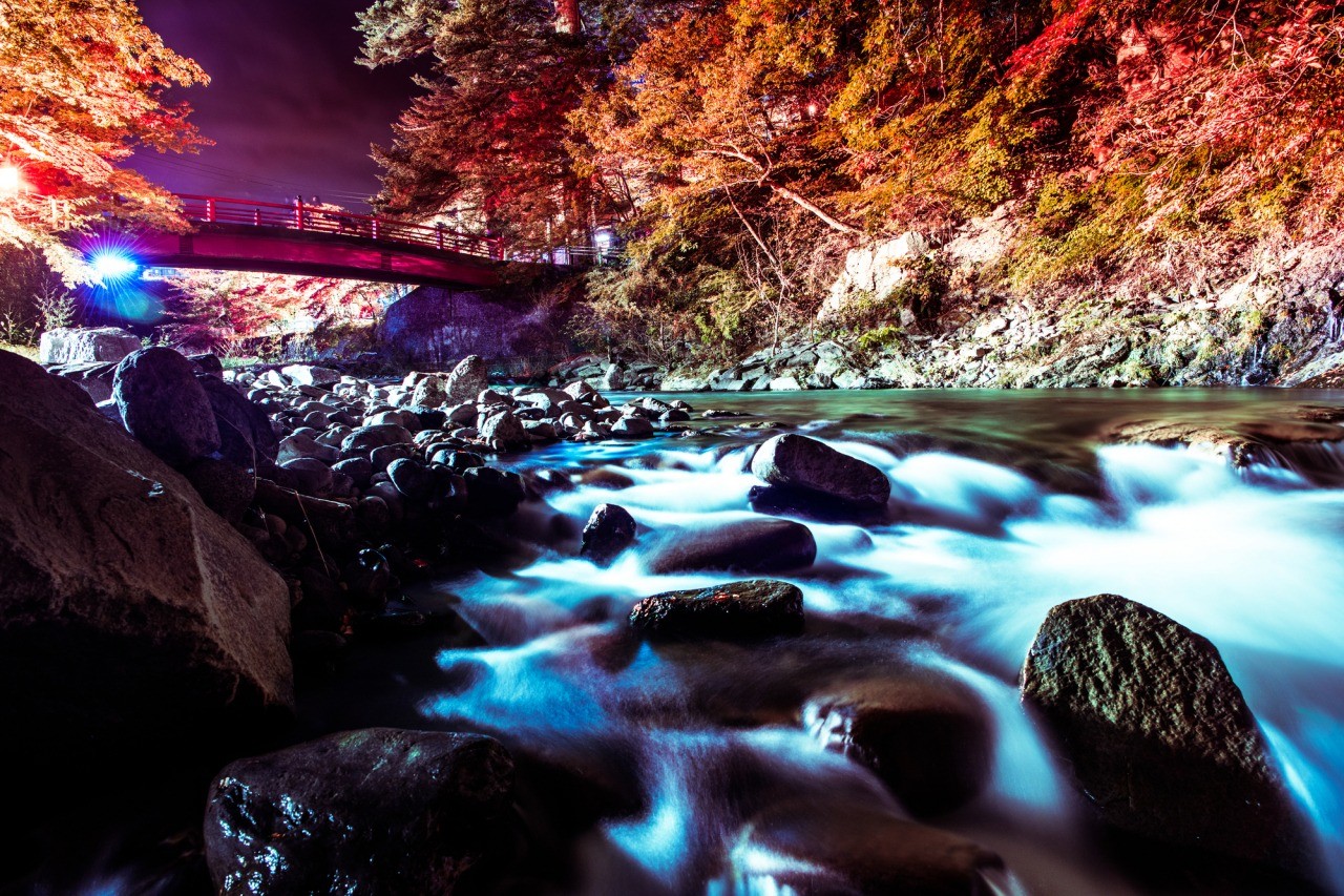 The autumn colours of Nakano Maple Mountain make it a leading spot for viewing foliage even in Aomori Prefecture. It is a historic foliage viewing spot that is said to have begun when the feudal lord of the Hirosaki Domain, Tsugaru Yasuchika, ordered for 100 varieties of maple seedlings to be transplanted from Kyoto. The foliage is so red that it appears to be on fire during the day, and the illuminated foliage is reflected on the waterfall and stream at night, creating a wondrous space.
