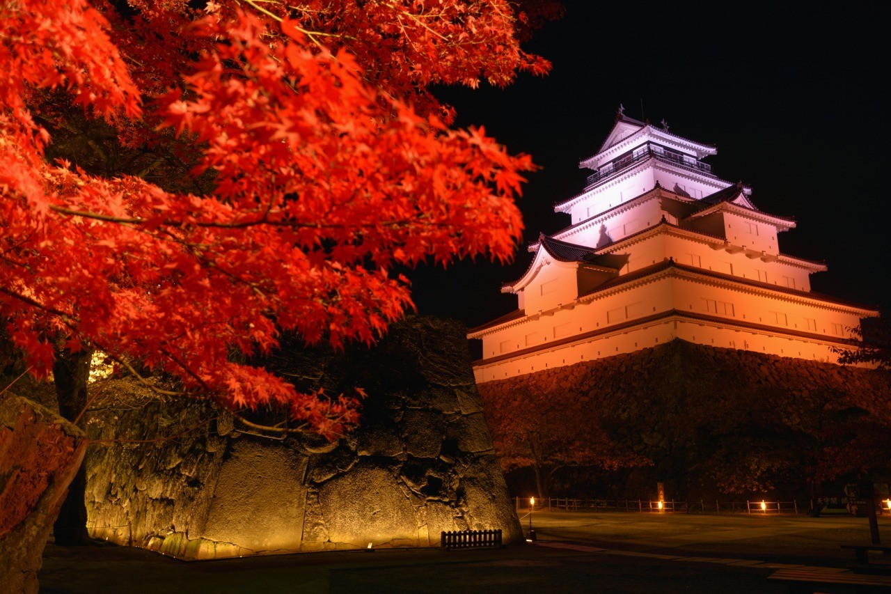 Tsuruga Castle Park is famous for its thousand cherry blossom trees illuminated at night. The surrounding trees are also illuminated in autumn to show off the vividly changing colours of their leaves. Meanwhile the castle fills with visitors during the “Aizue Candle Festival” each winter. The view of the snow-covered castle illuminated by traditional hand-decorated candles is unforgettable!