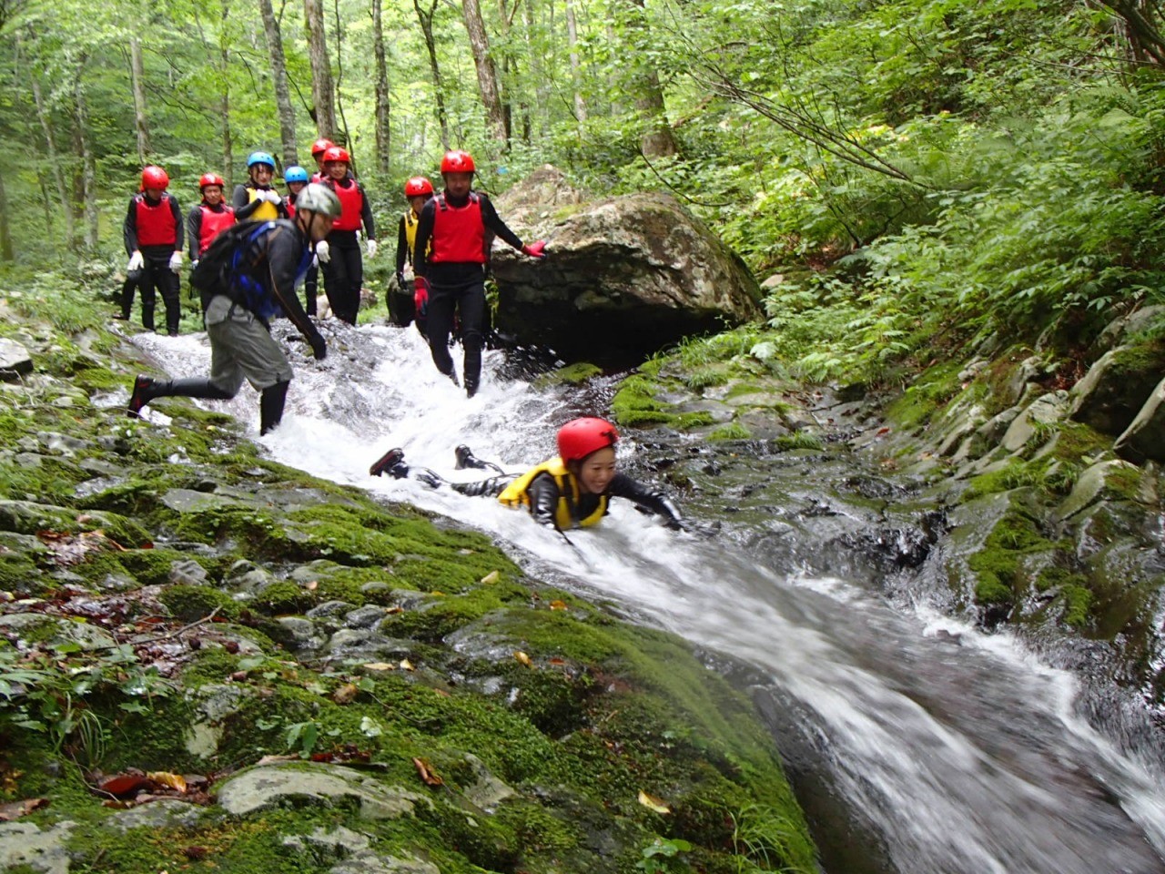 Canyoning is one of the outdoor activities offered by ZAOC in the Zao Mountains and the great outdoors of Tohoku, using the natural mountain streams of Kawasaki Town. It is fun to use the water slides, waterfall basins, and more that utilize the natural terrain. Professional staff safely lead the way, so both adults and children who are beginners can enjoy themselves.