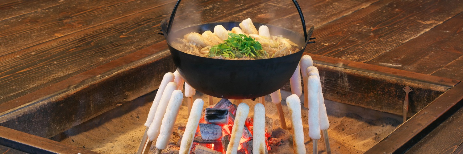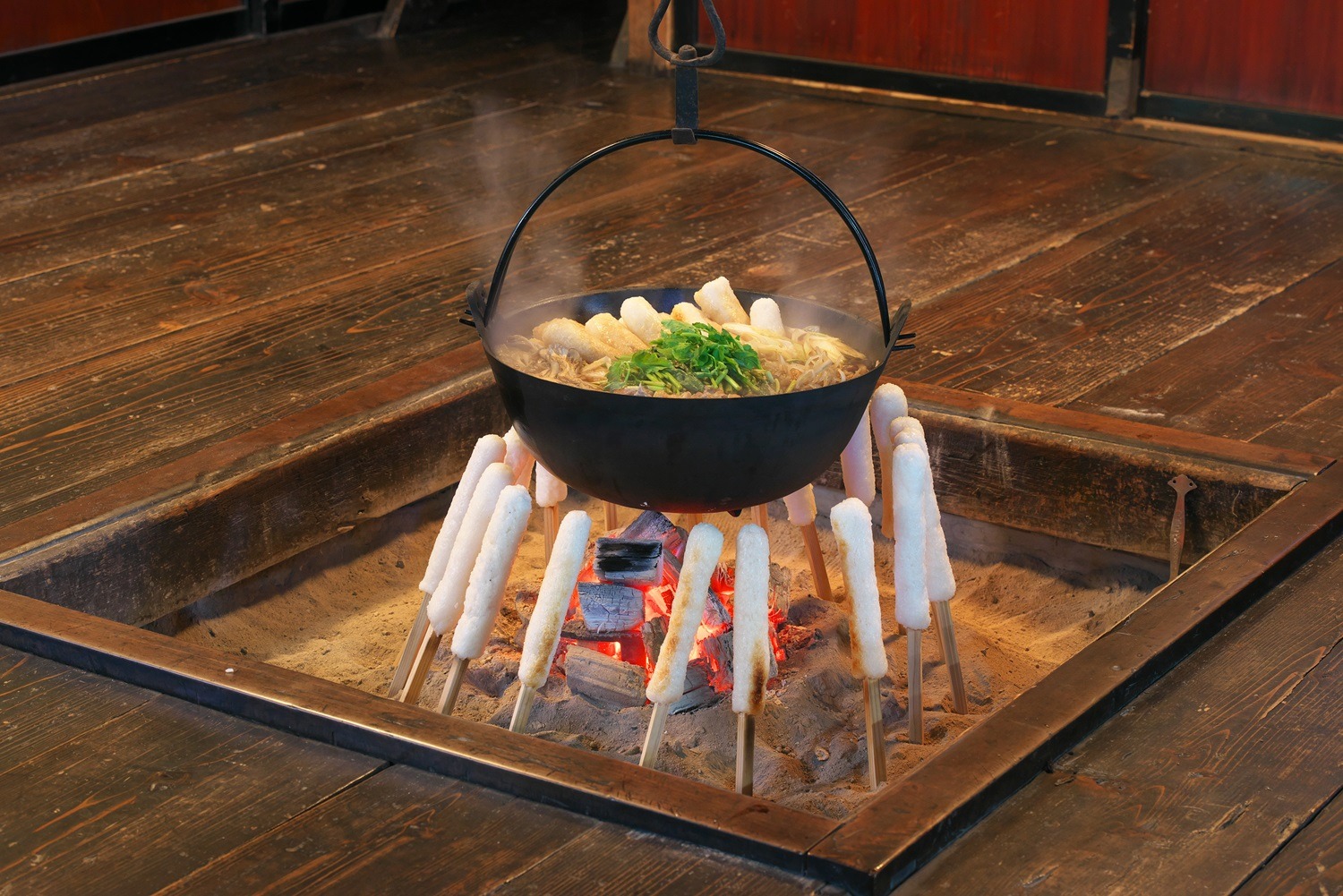 まずはご飯をつぶして杉の串に筒状に付けて焼いた「たんぽ」を作り、1本は特製味噌で味わいます。さらにたんぽや比内地鶏などを具材にしたきりたんぽ鍋を作っていただきます!作りたての味は格別ですよ♪