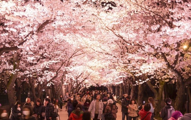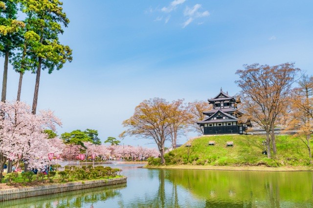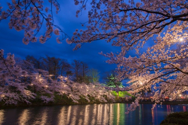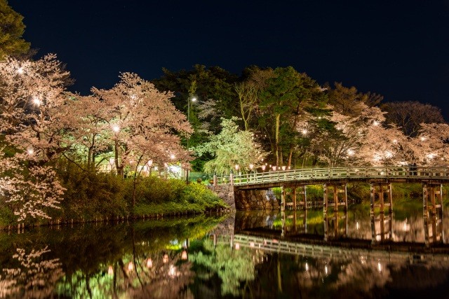 夜はぼんぼりが灯り、淡いピンクが妖艶な夜桜へと変わります。ライトアップされた桜と高田城三重櫓、そして桜がお堀の水面に映る様も、幻想的でフォトジェニック。