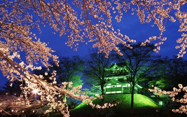たかだじょうしこうえんかんおうかい上野の恩賜公園、弘前城公園とともに、日本三大夜桜の一つに数えられる高田公園の桜。高田城と桜の組み合わせに日本情緒が漂います。