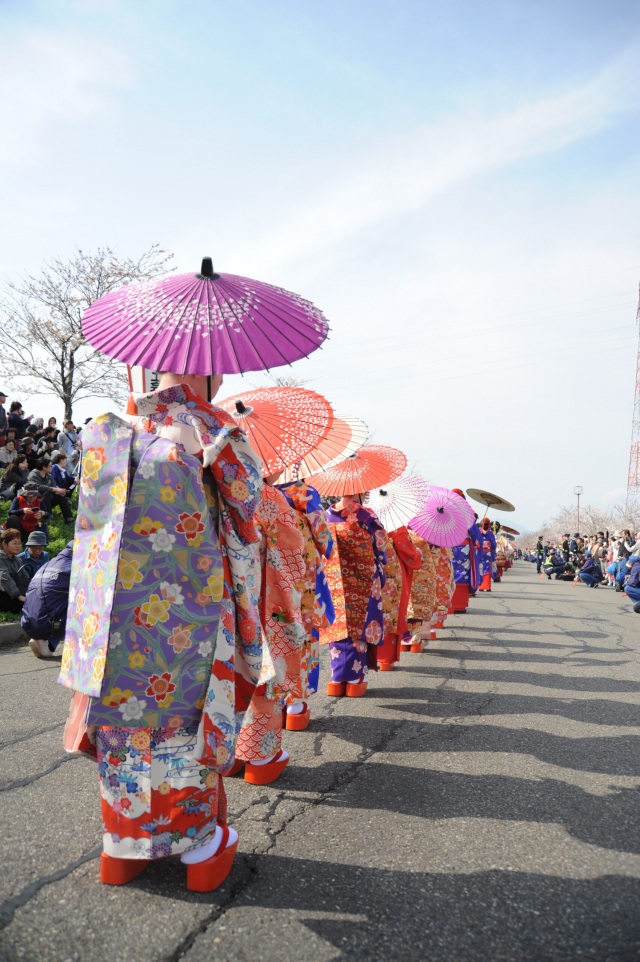 毎年4月の第3日曜日に行われる「分水おいらん道中」では、絢爛豪華な衣装に身を包んだ3人の花魁(おいらん)たちが、総勢70人ものお供を連れ、大河津分水の桜並木の下をしゃなりしゃなりと練り歩きます。