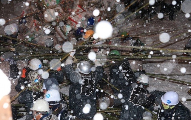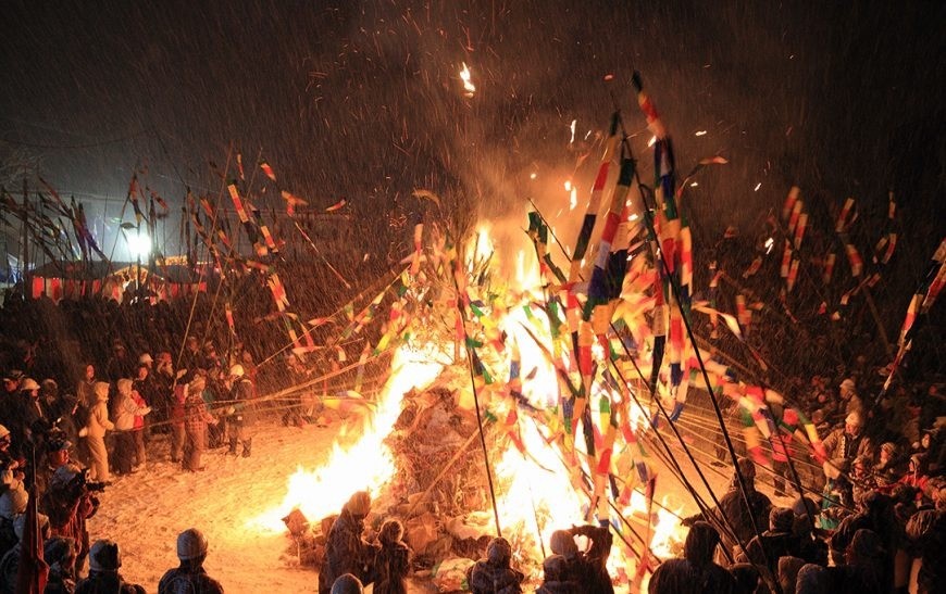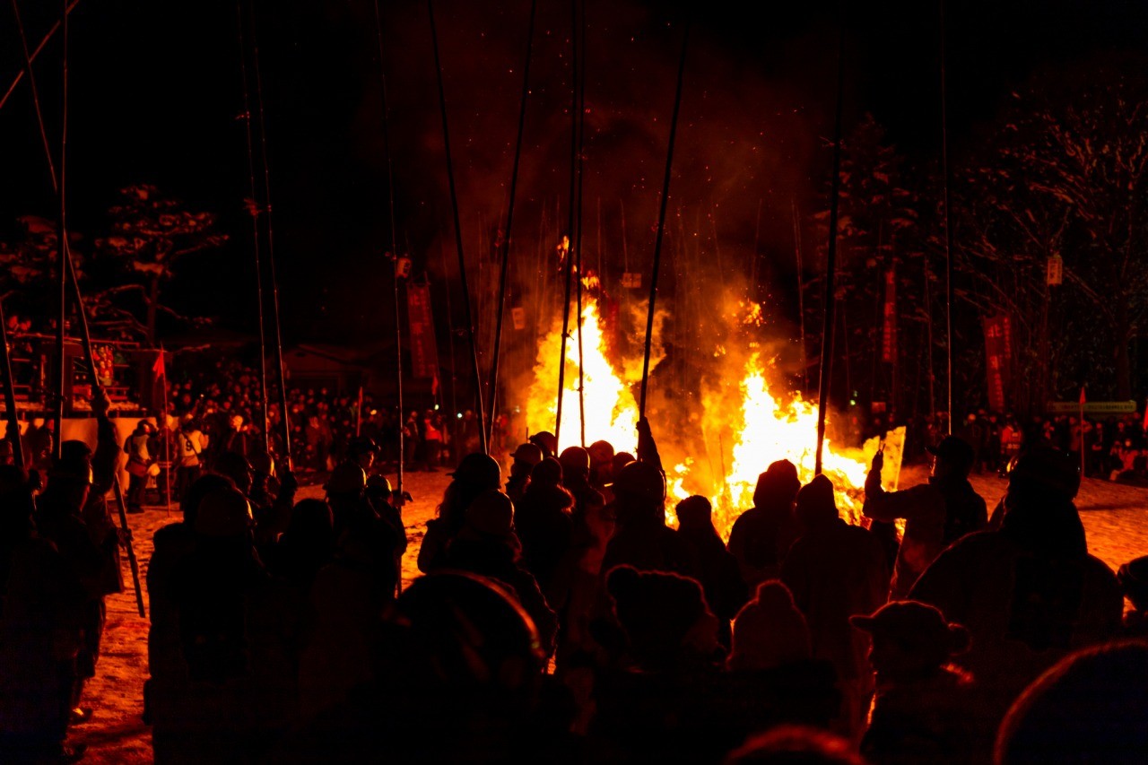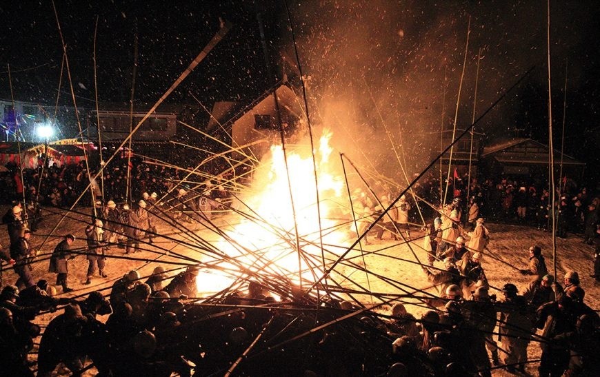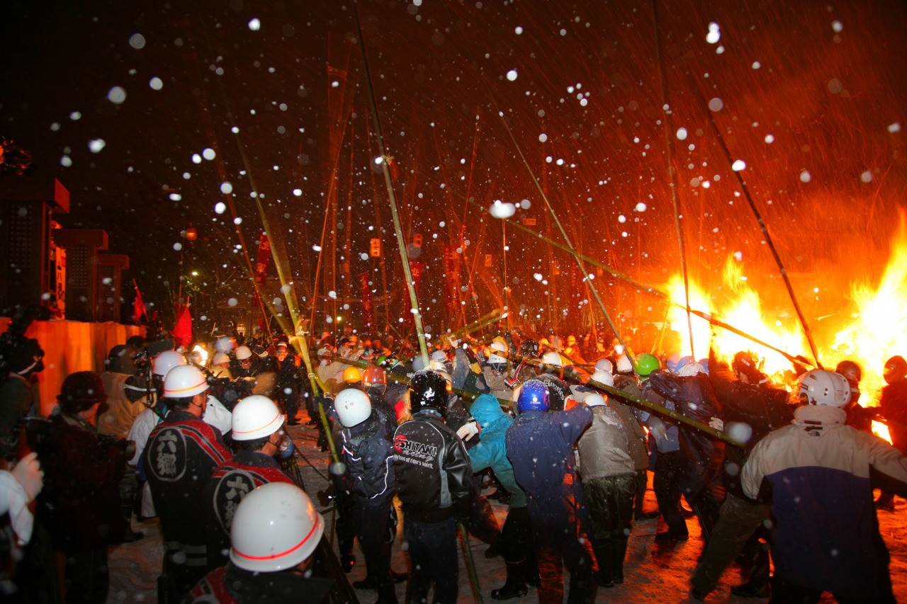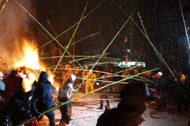 この夜に使用される青竹は数千本に及ぶといわれ、7~8メートルの青竹を持った若者たちが南北に分かれて激しく打ち合い豊作を祈願します。北軍が勝てば豊作、南軍が勝てば米の値が上がるといわれています。戦いが終われば同じ町の人々。激しい打ち合いを終えた男衆は、「今年も豊作であるように」と念じながら割れ竹でご神火を打ち合います。火柱が立ち上がり、火の粉が天に舞う幻想的な風景を目にすることができます。