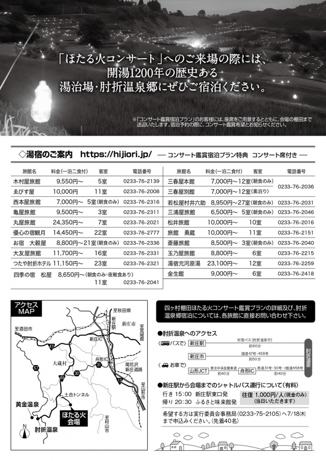 ■ 主 催:四ケ村の棚田ほたる火コンサート実行委員会 電話番号0233-75-2105