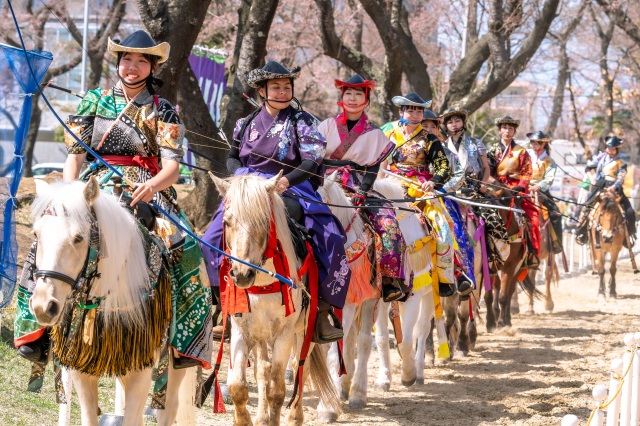 さくらやぶさめ和式馬術に憧れ、競技として流鏑馬を愛好する女性が集まり、試技を披露する日本で唯一の大会。全長200mの走路をほんの十数秒で駆け抜ける勇壮な騎射の供覧となります。桜並木の下で、華やかな衣装を纏って馬を駆る女性騎士たちの弓さばきは必見。珠玉の和式馬術を和種馬で演じるという醍醐味にもご注目ください!